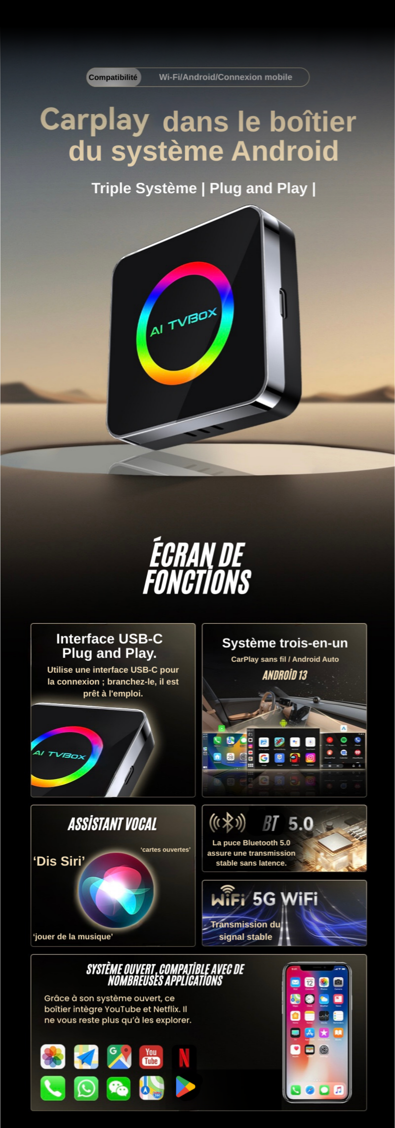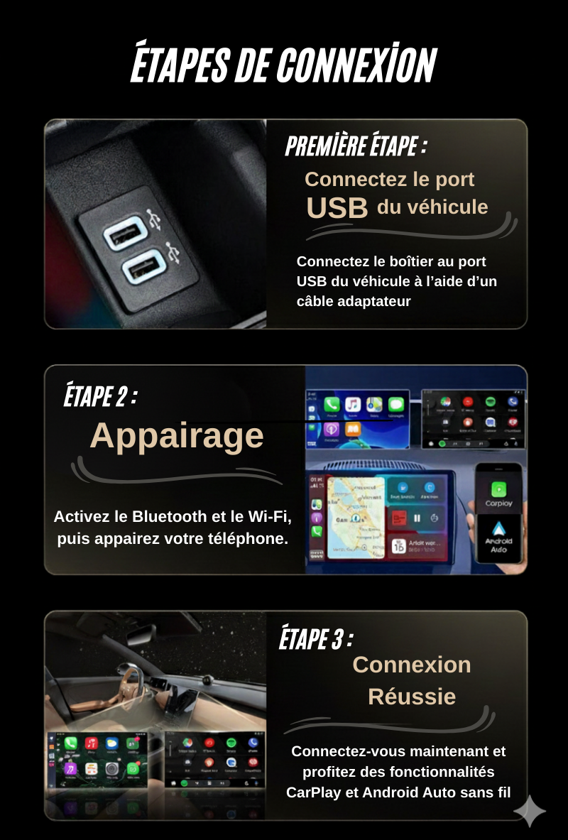 Ce boîtier est compatible avec les véhicules équipés de CarPlay filaire.