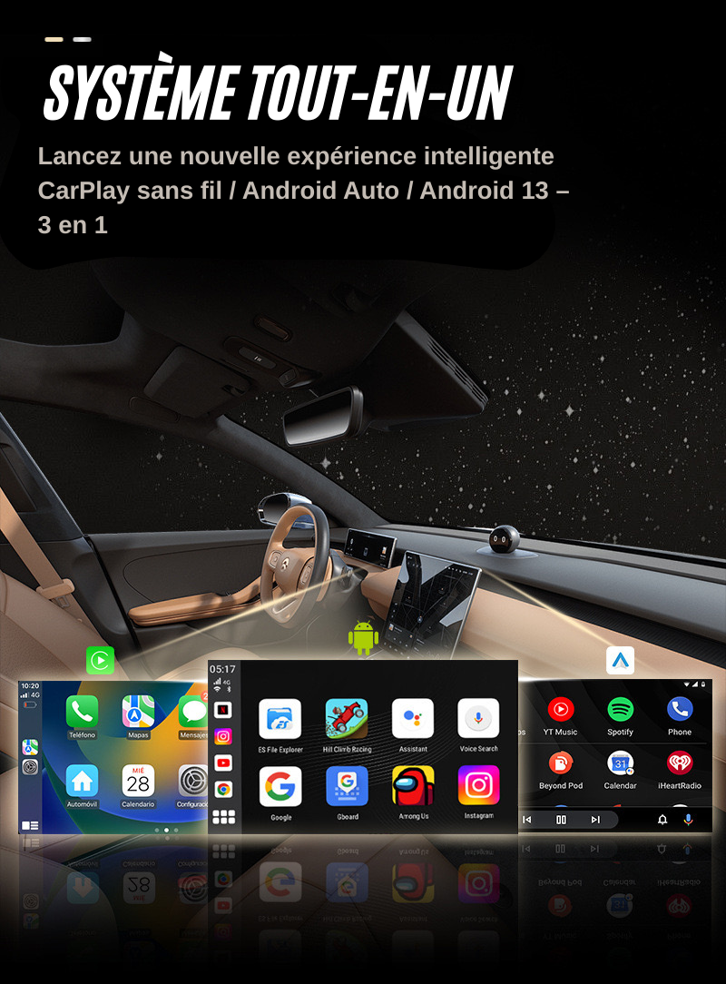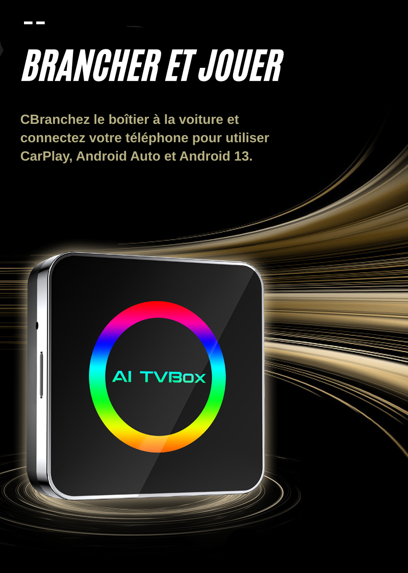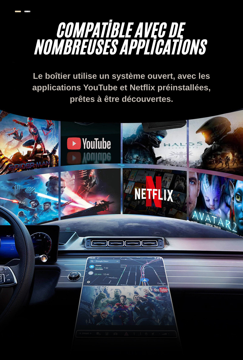 Ce TV Box pour véhicules compatibles CarPlay fonctionne en plug & play. Il est prêt à l’emploi en 15 secondes après branchement. YouTube, Netflix et autres applications sont utilisables immédiatement, sans configuration.